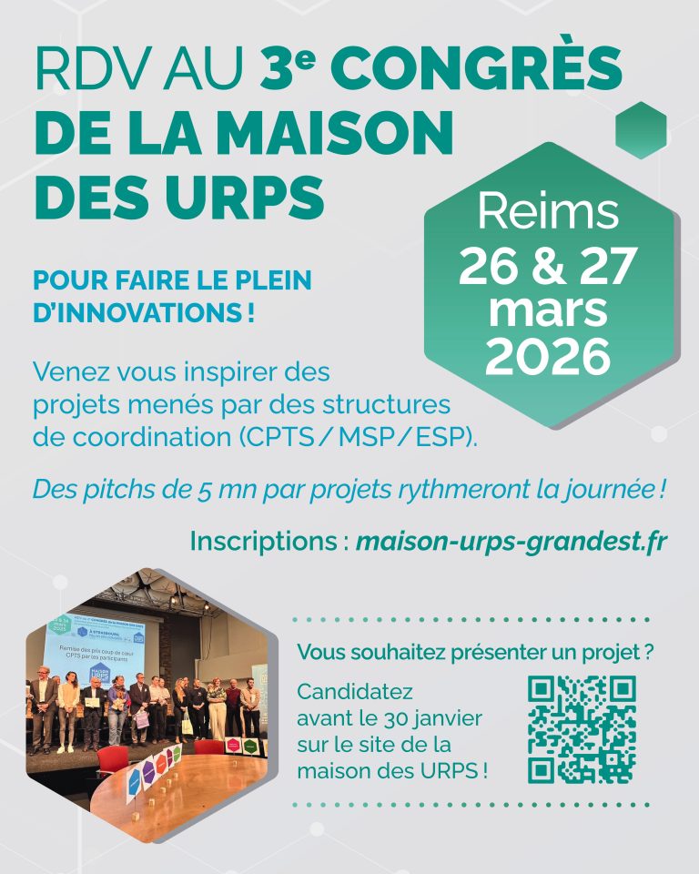 La Maison des URPS vous propose d’être partenaire. De la même manière que pour la 2ème édition du congrès à Strasbourg en 2025, il est proposé que les Professionnels de Santé des dispositifs de coordination du Grand Est (CPTS, MSP, ESP …) puissent présenter librement, partager, valoriser leurs projets et actions menées collectivement en lien avec leurs missions. Les freins et difficultés peuvent être également mis en avant pour exposer les raisons et enrichir les expériences au sens large.